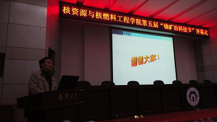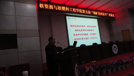 首先谭凯旋院长向大会亲切致辞,谭院长从于世界做贡献,为国家寻资源出发,肯定了 “铀矿冶”科技节的深远意义。立足于我国铀矿资源紧缺而当今世界对核资源越来越重视的现状,告诉了同学们专业所担当的责任的重要性,指出寻找资源和提高资源开采利用率是今后的必然需求。再从同学们以后的工作性质出发,告诉大家专业对我们的成长、成才有着十分明显的促进作用。教导学生积极参与科技活动,立志成才,报效祖国。最后,谭院长殷切希望同学们都能取得辉煌的成绩,拥有成功的人生。