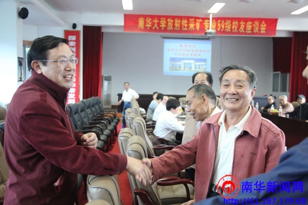 座谈会上,校党委书记邹树梁教授致欢迎词,他首先对放射性采矿专业59级校友返校表示热烈欢迎,并向校友们简单介绍了学校的发展情况,还与校友们一起回忆了50年前建校的艰辛和足迹。副校长丁德馨教授代表学校从合并以来学校大事回顾、教育教学质量、学科建设与科学研究、社会服务、学校特色与优势、发展设想等六个方面详细介绍了学校近年来的建设和发展。原衡阳矿冶工程学院教师、中国书画家协会理事游运江作为教师代表讲话,他回忆了50年前师生同吃同住同劳动的场景,感慨当教师必须作人的表率,要了解学生、身体力行。核资源与核燃料工程学院院长谭凯旋教授从学院基本情况、学科建设、科学研究、发展设想等方面详细介绍了学院的发展情况。之后,校友们进行自由发言,畅谈往事。