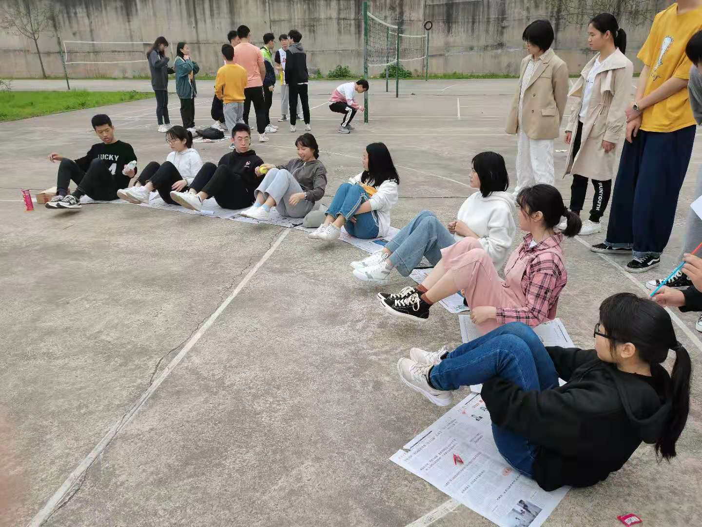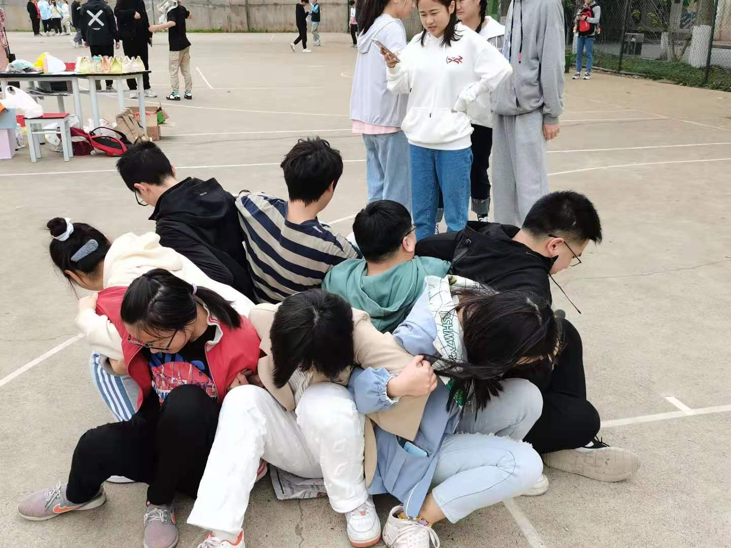 为了丰富同学们的课余生活,拉近男女生之间的距离,增进同学间的友谊,使大家更好的融入集体。资环安学院心理部于3月27日上午9:30在篮球场举办男生女生素质拓展活动。