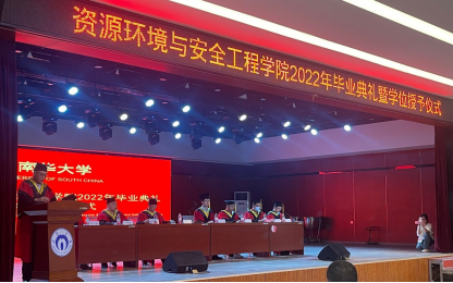 在热烈的掌声和欢呼声中,院长张志军老师在毕业典礼上深情致辞。张志军老师首先代表学院,向圆满完成学业,即将踏上新征程的2022届全体毕业生表达了真诚的祝贺,向辛勤付出的每一位老师表答衷心的感谢。院长表示,南华创校之初心,是为“国计民生”,是为发展核武器,发展国防事业和核工业,其代表就是本学院的铀矿采冶,南华的“核特色”。就在资环安,学院虽几经分合,但如今已成为学校工科最大学院,拥有围绕铀矿采冶最齐全的学科、专业和学位点,学院始终坚持核工业“四个一切”精神,以强核报国为己任,不忘初心,牢记使命,无论风云变换、行业起伏,一直坚守着为国防核工业培养铀矿采冶人才的唯一阵地。经过求学阶段,大家学会了面向世界、面向未来、面向未知的技能和智能,提升了感悟新时代、紧跟新时代、引领新时代的素质和能力;通过学习,使自己成为了新知识、新观念和新思维的能够担当民族复兴大任的时代新人。最后张志军老师代表学院赠送同学们一份礼物,分别是感恩、向学、诚信、向善和乐观之心,勉励毕业生们在逆境中保持坚强乐观,永不言弃;在顺境中,保持谦虚谨慎、戒骄戒躁。