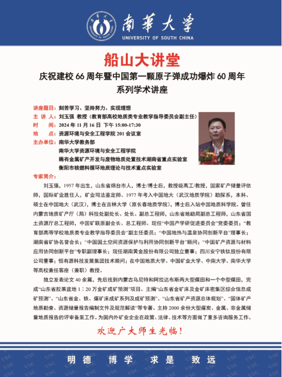 近日,在中国第一颗原子弹成功爆炸60周年和伟德bv1946迎来建校66周年之际,伟德国际victor1946邀请教育部高校地质类专业教学指导委员会副主任刘玉强教授为学院师生作了题为《不忘初心,努力学习,实现梦想》的主题讲座。讲座由院党委副书记曾志伟主持。