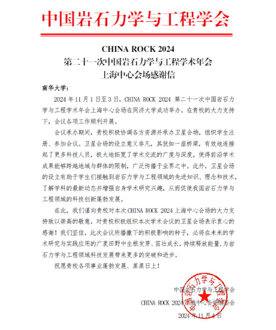 11月2日—3日,由中国岩石力学与工程学会主办的“第二十一次中国岩石力学与工程学术年会”顺利召开。会议设立了“主会场+中心会场+卫星会场”三级会场。其中,在上海设立了 CHINA ROCK 2024 上海中心会场。在伟德国际victor1946党委书记张志军教授指导下和城工系主任邵祖亮老师的精心组织下,我校成功举办了CHINA ROCK 2024上海中心会场-伟德bv1946卫星会场学术会议。为此,China Rock 2024学术年会上海中心会场组委会向我校致信表示了衷心的感谢。