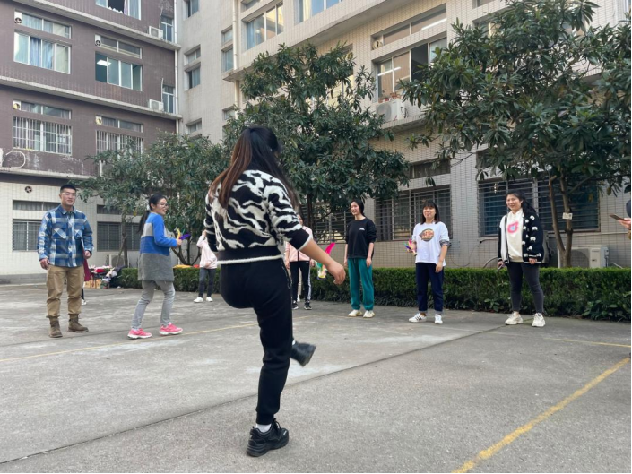 随后对全院39名女职工进行了分组,共分成四个参赛队伍。女工委员王逸韵对三轮比赛的参赛规则进行了介绍,比赛为团体赛,共设置为三轮项目,分别是“踢毽子接力赛”活动、“踢毽打靶”活动、“圆圈盘踢”活动。赛场上,翻飞的毽子,如燕儿般轻盈的身姿,大家各显身手,现场笑声不断。