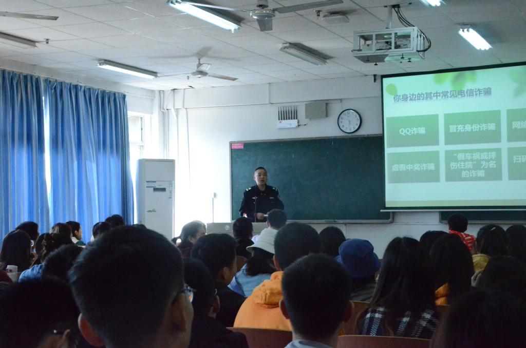首先,李照以最近校园出现的几起研究生电信诈骗事件切入本次讲座主题,希望大家通过本次讲座加强防范意识,保护好自身生命财产安全。 随后,盛情邀请本次讲座主讲人宋建业老师上台为大家普及防范电信诈骗知识。宋建业立足校园,以切身所见所闻举例子,从不良校园贷、淘宝刷单到各种大学生电信诈骗案件,生动有力地剖析了电信诈骗的本质,将防范观念深入人心。同时,他提醒大家保护好自身安全,校园里遇见可疑的人或事可拨打保卫处电话。