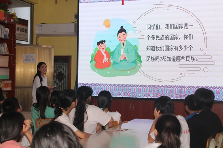 活动开始前,志愿者肖俊琳向孩子们抛出问题,询问孩子们都知道多少个民族,孩子们纷纷举手回答道,“壮族,藏族!”“老师,我知道,还有满族!”“朝鲜族!”等到孩子们都回答完自己的问题后,志愿者再将问题引到民族服饰上,“大家有没有了解过相关的民族服饰呀?有没有喜欢的衣服呢?”提问一出,孩子们又非常兴奋地回答:“有!”志愿者向孩子们展示了藏族、维吾尔族等一些极具特色的民族服饰,进而通过讲述民族团结进步的故事,将铸牢中华民族共同体意识扎根在青少年心中。