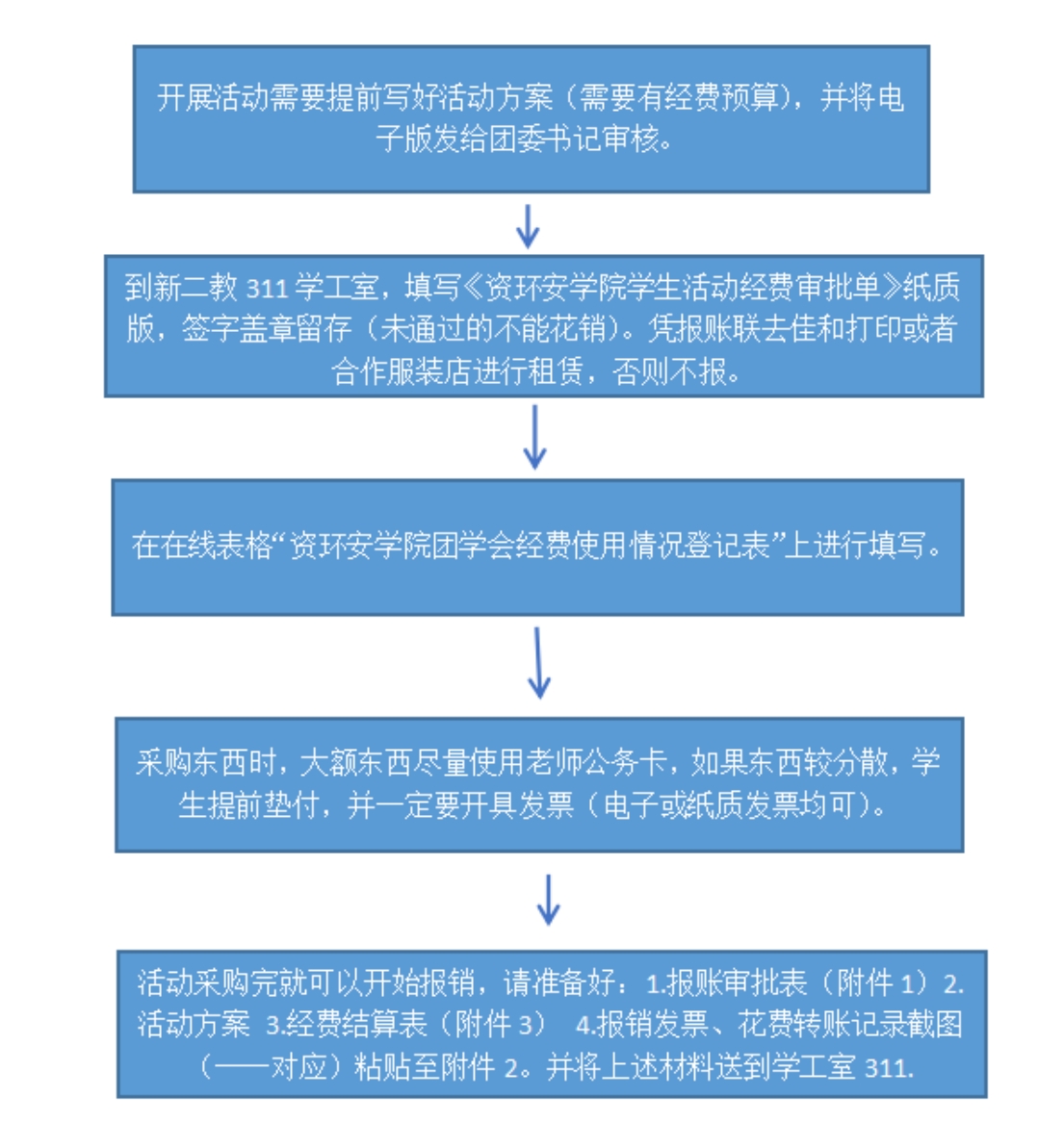 第十条 每次活动必须设活动负责人(一般由学生担任)一名,指导老师(主要负责活动财务相关事宜,原则上应为学院正式在岗职工)一名,不能由一人兼任。开展学生活动须事前向学工室提交活动申请及经费预算,填写《资环安学院学生活动经费审批单》(以下简称《申请表》),申请流程如下: