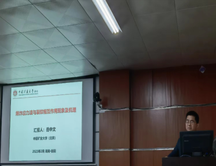 中国矿业大学(北京)岳中文教授报告题目为“爆炸应力波与运动裂纹相互作用现象及机理”。