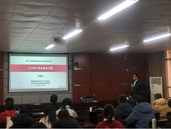 2023年12月20日,我院举办2024年国家自然科学基金项目申报启动会暨中国科学院武汉岩土力学研究所韦昌富教授学术讲座。韦昌富教授作了题为“土力学中某些基本问题”和“国家自然科学基金项目申请中的一些关键问题”的学术报告,报告由院长张志军教授主持,相关专业教师、研究生、本科生100余人聆听了本次报告。